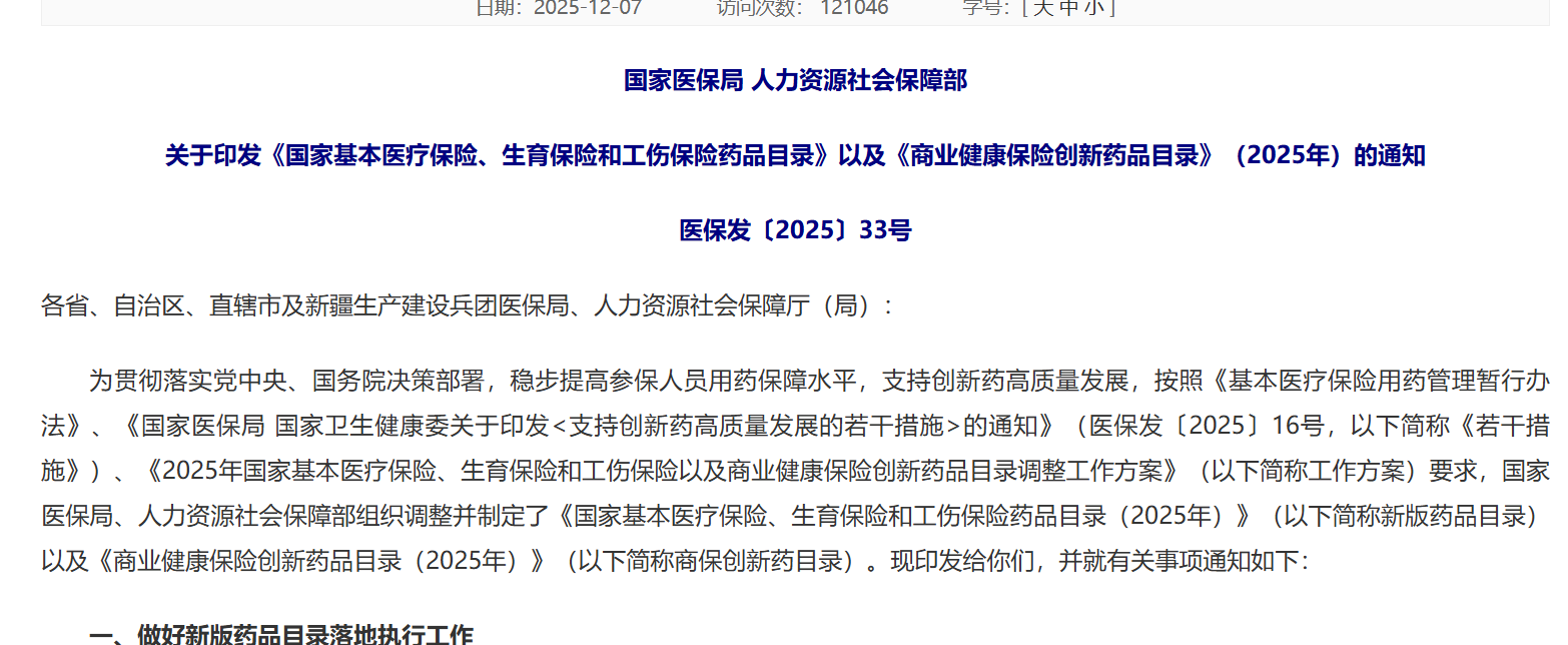 12月7日,国家医保局在广东广州正式发布2025年国家医保药品目录及首版商保创新药目录。其中,2025年国家医保药品目录新增114种药品,含50种一类创新药,总体成功率达88%,较2024年的76%显著提升;首版商保创新药目录则纳入19种药品,两类目录共同完善医保保障体系。