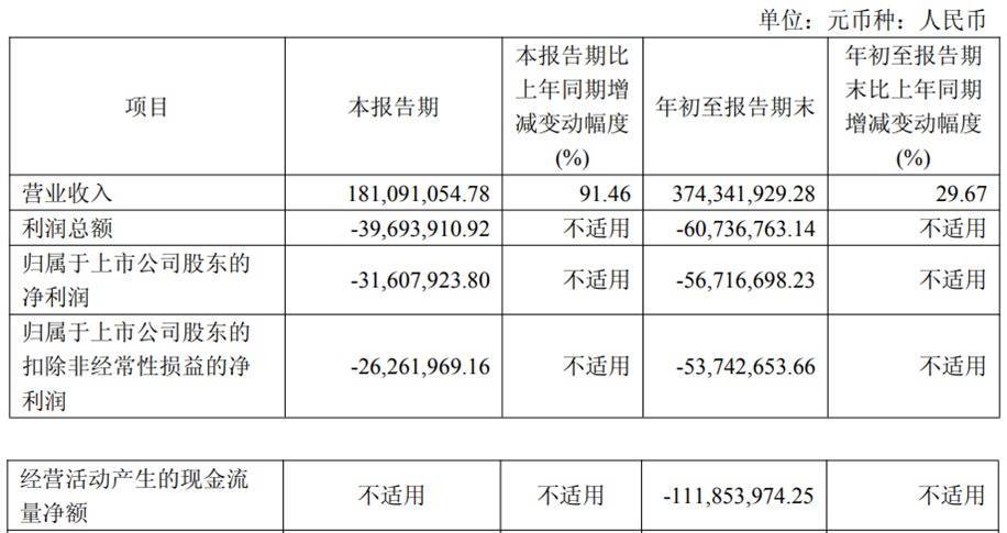 2025年前三季度,公司实现营业收入3.74亿元,同比增长29.67%;归属于上市公司股东的净利润为-5671.67万元,上年同期为-3120.03万元;归属于上市公司股东的扣非净利润为-5374.27万元,上年同期为-3424.42万元;经营活动产生的现金流量净额为-1.12亿元,上年同期为-6438.46万元。