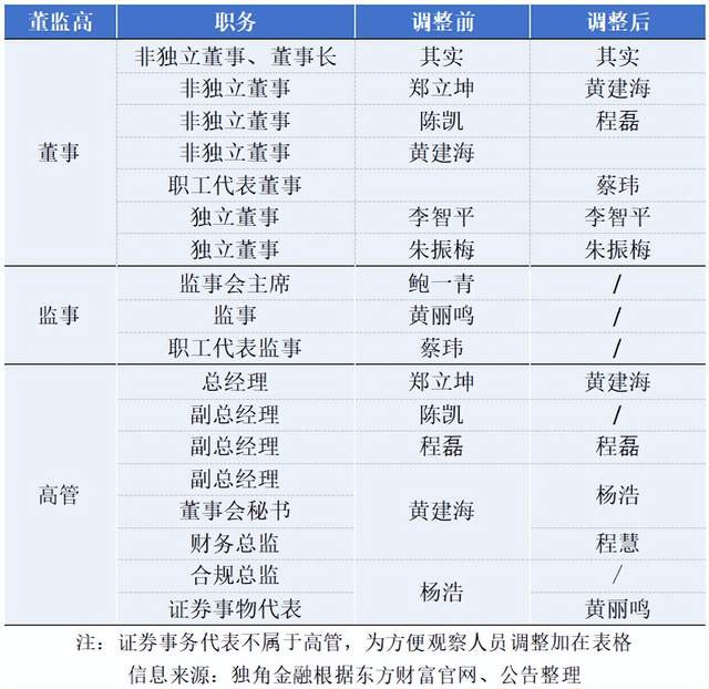 东方财富董监高迎来重大调整。创始人其实继续担任董事长,总经理职位则有了新的人选,原副总经理、财务总监、董事会秘书黄建海升任总经理,兼任副董事长。