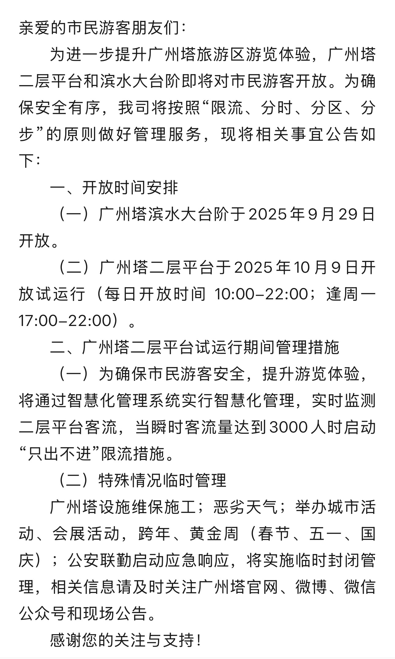 广州塔二层平台将于10月9日实施开放试运行,必将成市民游客打卡点。为确保二层平台平稳有序试运行,由广州塔公司负责按照旅游景区模式进行运营管理,实施“限流、分时、分区、分步”的原则有序管理,每日开放时间为10:00-22:00(逢周一17:00-22:00),通过智慧化客流监测措施,瞬时客流量达3000人时将启动限流管控,如遇恶劣天气、重大活动、广州塔设施维保施工等特殊情况将调整现场管控措施,确保游览安全、舒适。